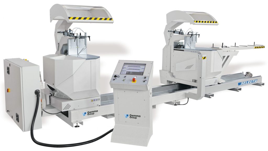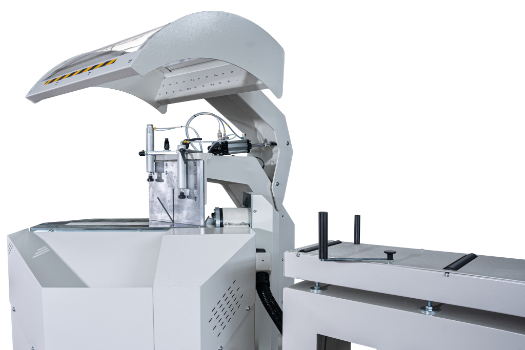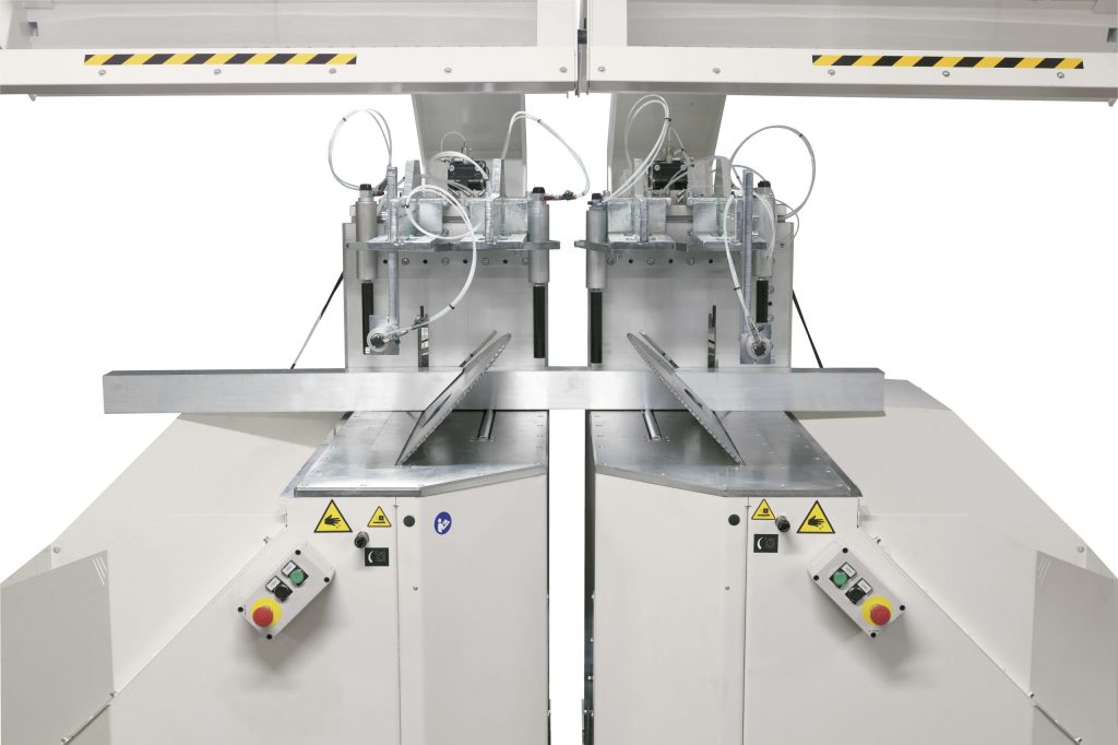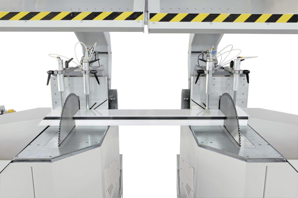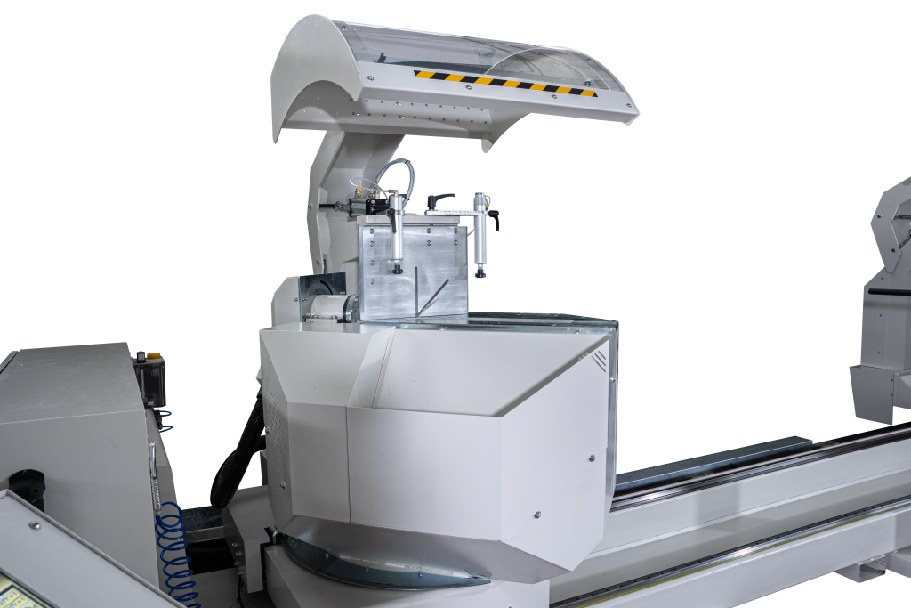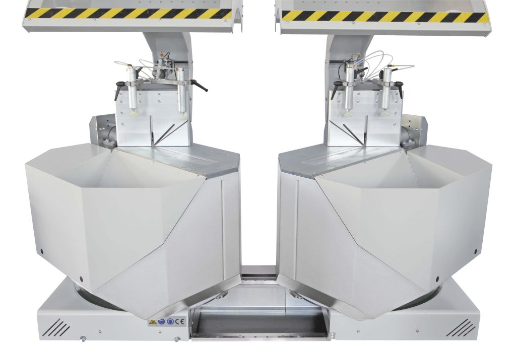 600 mm bileşik kesimler için yükselen, eğilen ve dönen bıçaklara sahip çift başlı kesim makinesi.